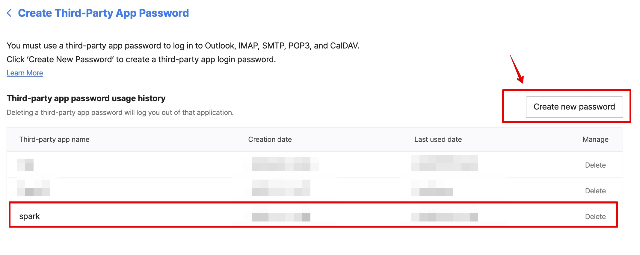 그러면 위와 같은 화면이 나온다. 네이버웍스 이메일에서 애플리케이션 비밀번호 생성 페이지는 희한하게 또 영어로만 나온다.(??) 처음에는 진짜 잘못 접속된줄 알았다.ㅋㅋㅋ 네이버 자체가 한국서비스인데 왜 영어로 나오지?싶었다. 아무튼 오른쪽에 있는 <Create new password>를 클릭해서 새로운 서드파티 앱 비밀번호를 만들어주면 된다. 네이버웍스에서는 서드파티 앱 비밀번호를 총 5개를 만들 수 있다고 하며, 한 번 만들고나면 기존에 만들어진 목록은 볼 수 있었으나 만들어진 암호는 다시 확인이 불가능해서 까먹으면 다시 생성해야했다.