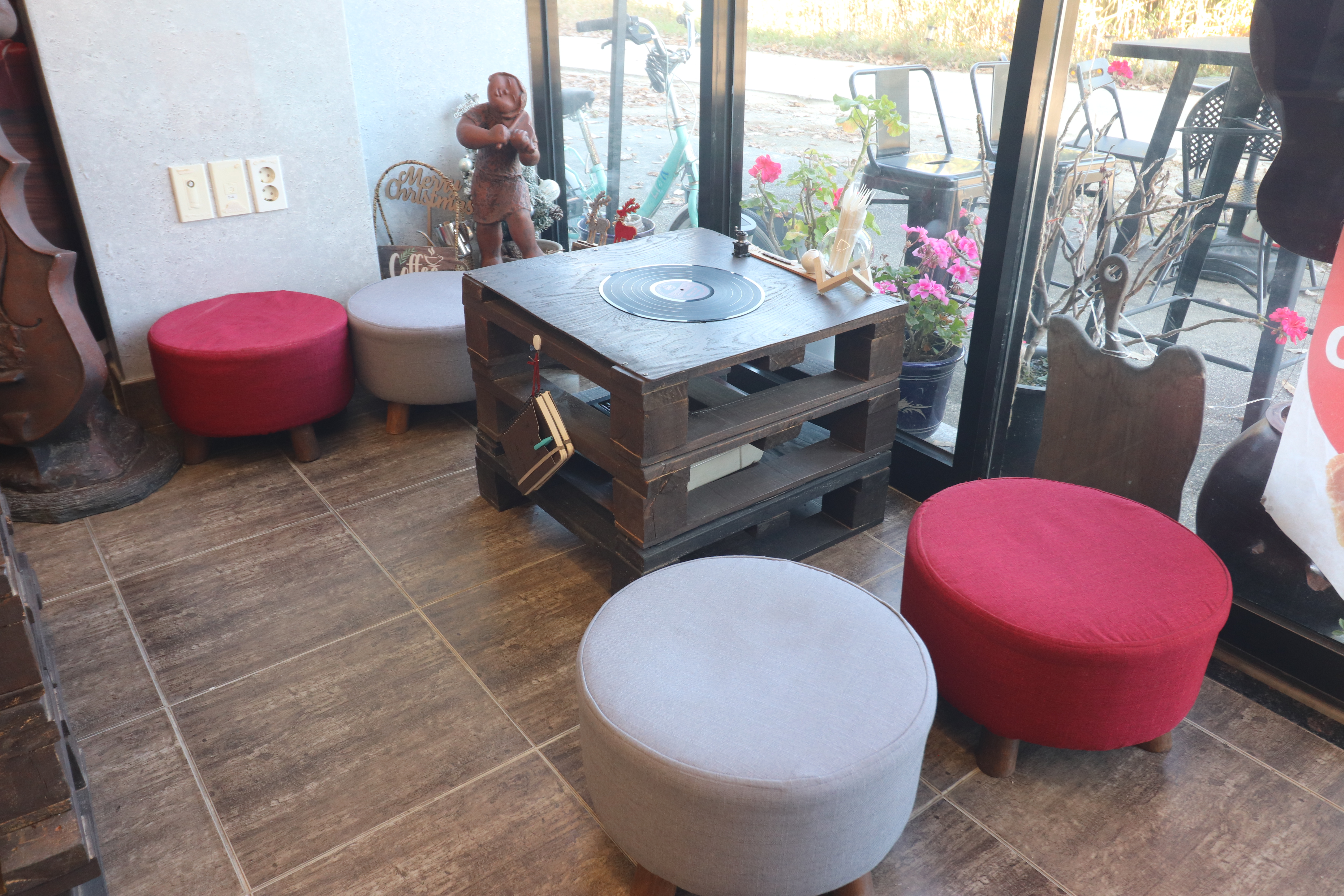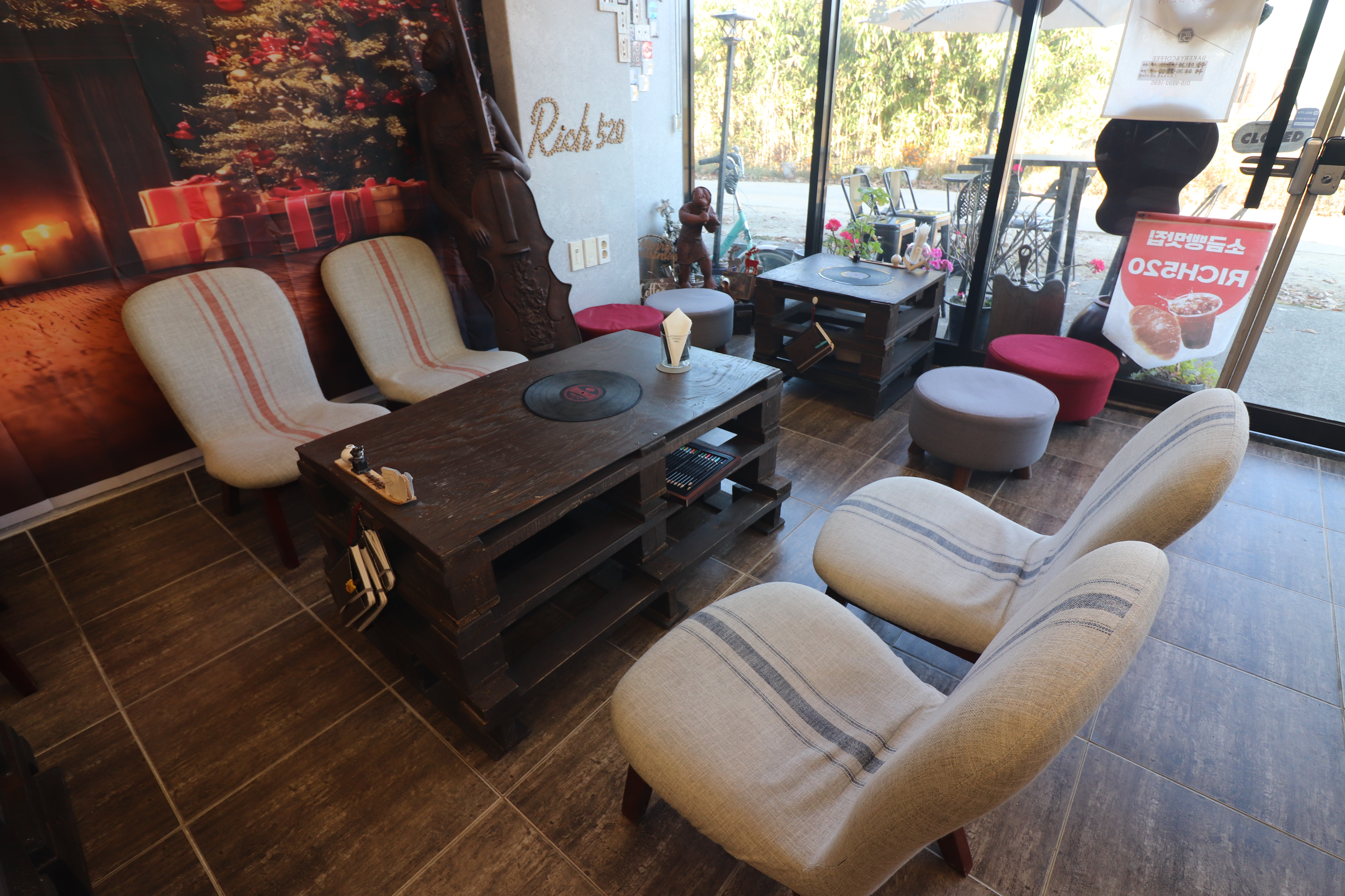 카페 곳곳에 있는 소품들과 아기자기하게 꾸며진 공간들이 참 보기가 좋더라고요. 테이블에는 LP판을 넣어서 독특하게 만들어두었는데 인상적이었습니다. 테이블 간격이 여유로운 편이었고 함께한 사람들과 대화를 나누거나 조용히 사색을 즐기기에 안성맞춤이었습니다.