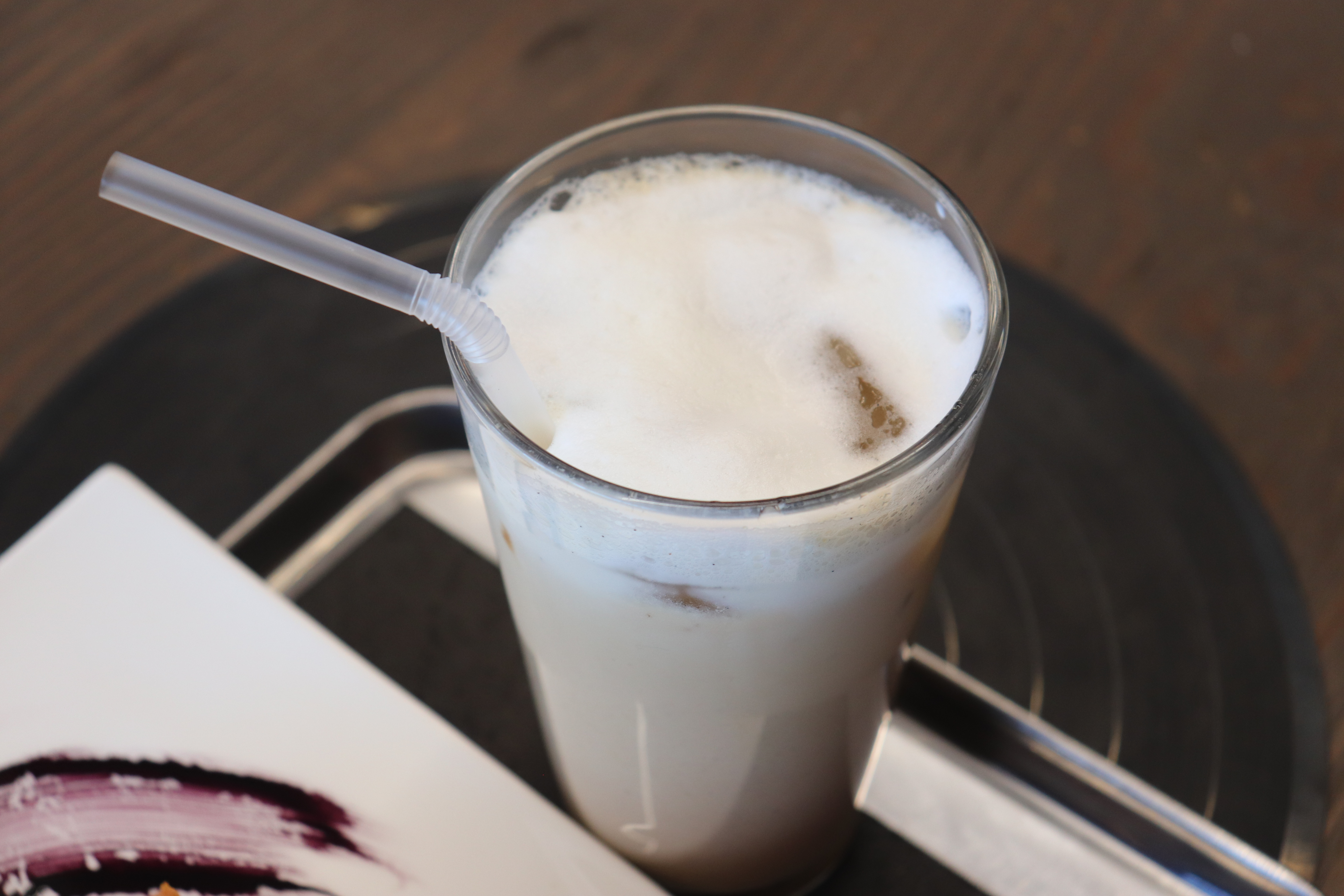 이 맛있는 빵들과 함께 곁들인 음료는 연유밀크라떼입니다. 여행의 피로를 한 번에 날려줄 달콤함이 필요해서 선택했는데, 탁월한 선택이었네요. 잘 저어서 마시니 달콤하고 고소한 맛이 입안에 퍼집니다. 특히 짭짤한 소금빵 한 입 먹고 달콤한 연유밀크라떼 한 모금 마시는 '단짠단짠' 조합이 진짜 좋더라고요.