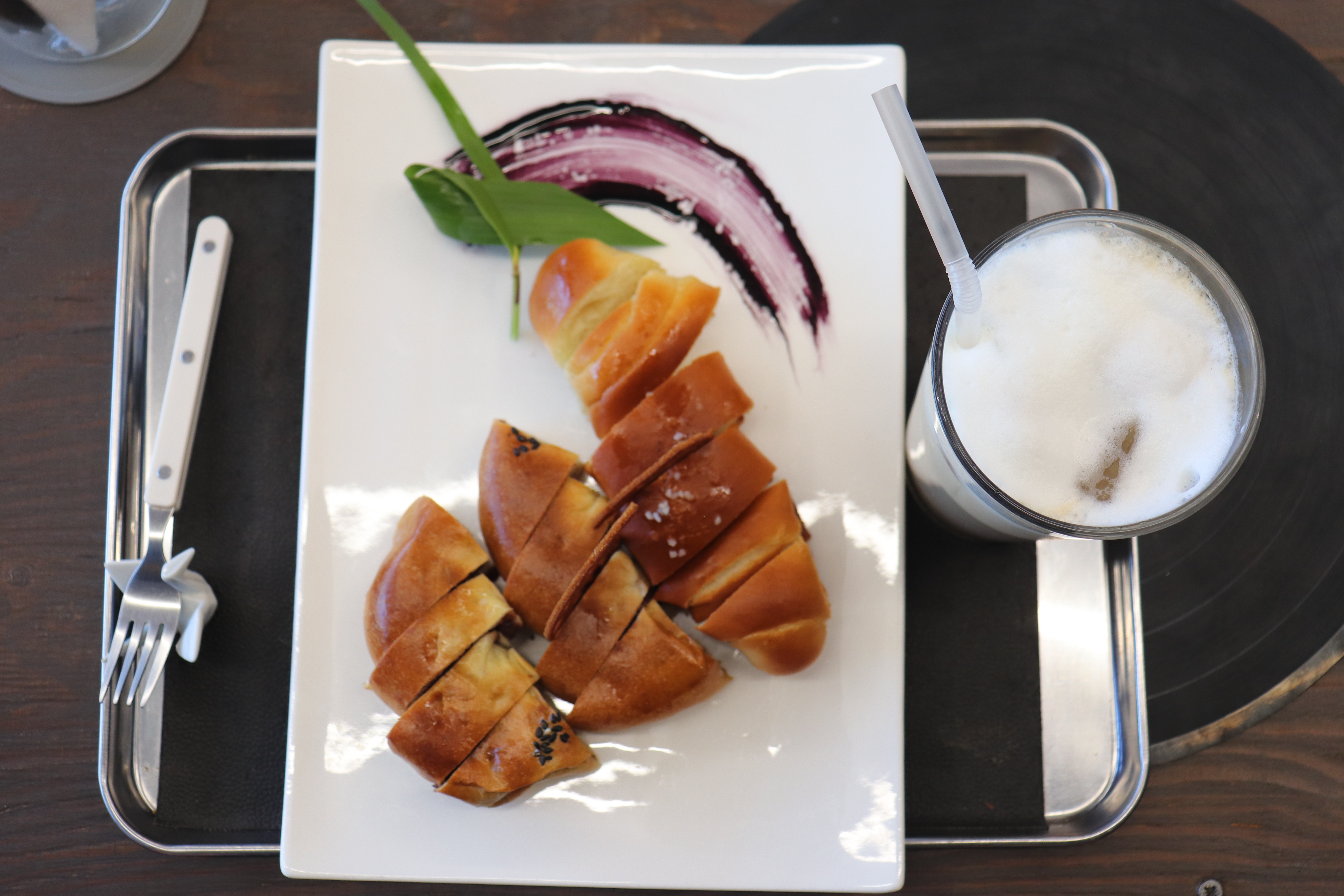 주문한 메뉴가 나왔습니다. 예쁜 접시에 담겨 나온 빵과 음료의 비주얼이 좋더군요.