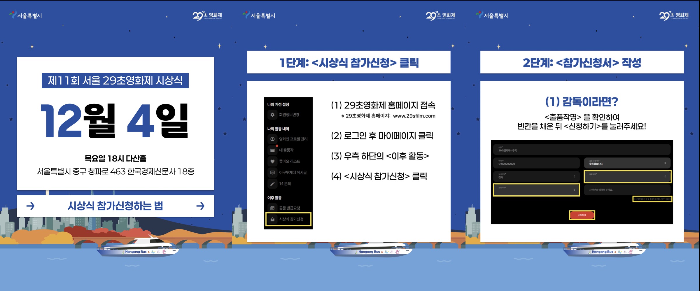 시상식 참가 방법은 크게 두 가지로 나뉩니다. 감독님들의 경우, 29초영화제 홈페이지에서 <시상식 참가신청>을 이용해서 참가신청서 작성 후 참가신청할 수 있습니다.