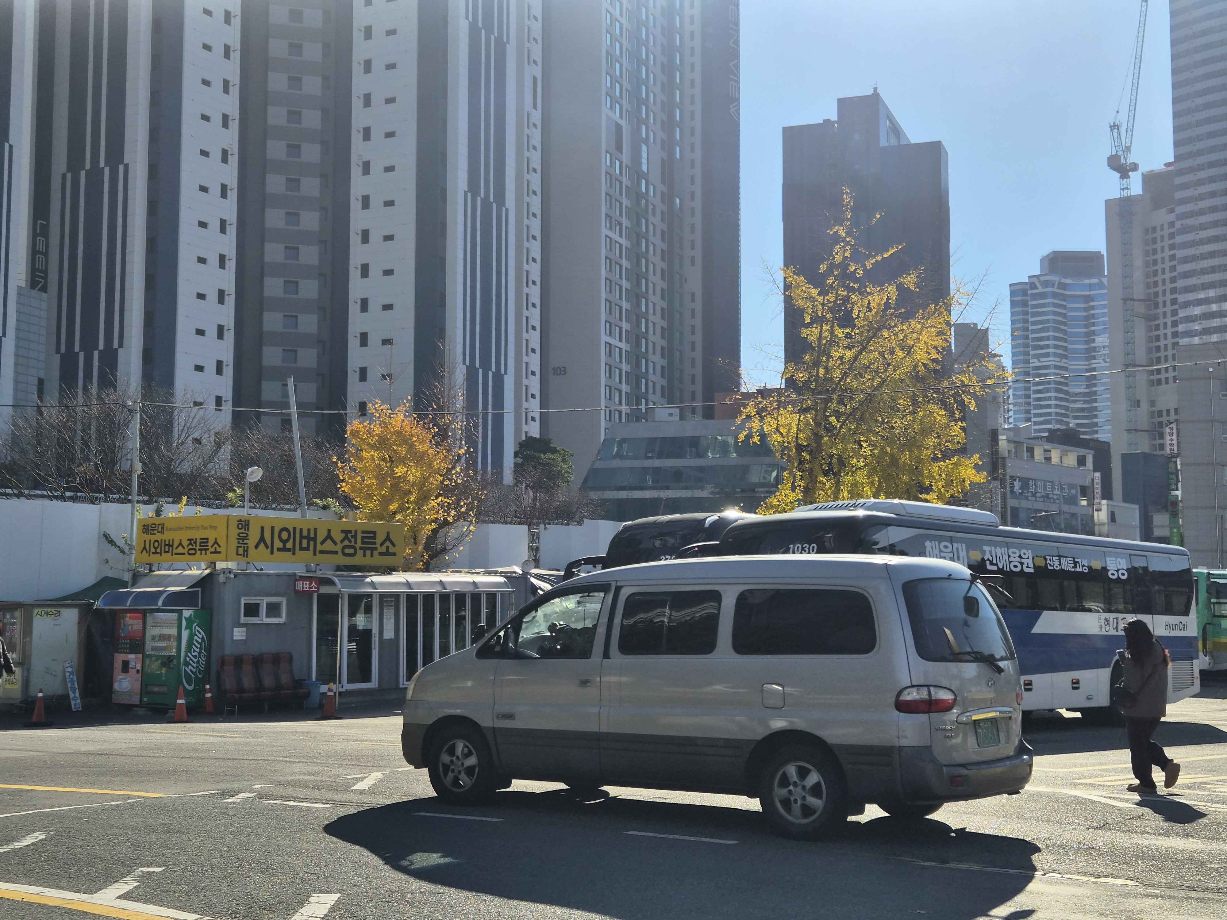 도착하는 곳은 부산해운대시외버스정류소. 그냥 간이 버스정류소 같은 곳이라서 편의시설 같은건 없고 화장실도 남자 화장실은 소변기쪽 다 보이게 문을 아예 못닫게 되어있기도하고 여러가지로 좀 불편하지만 해운대갈 때 제일 빨리 갈 수 있어서 소중한 곳이다. 여기에서 걸어서 해운대까지 약 10분~15분 저도 걸리며 1km 정도 떨어져있다. (은행나무에 단풍잎이 아직 있다고...?)