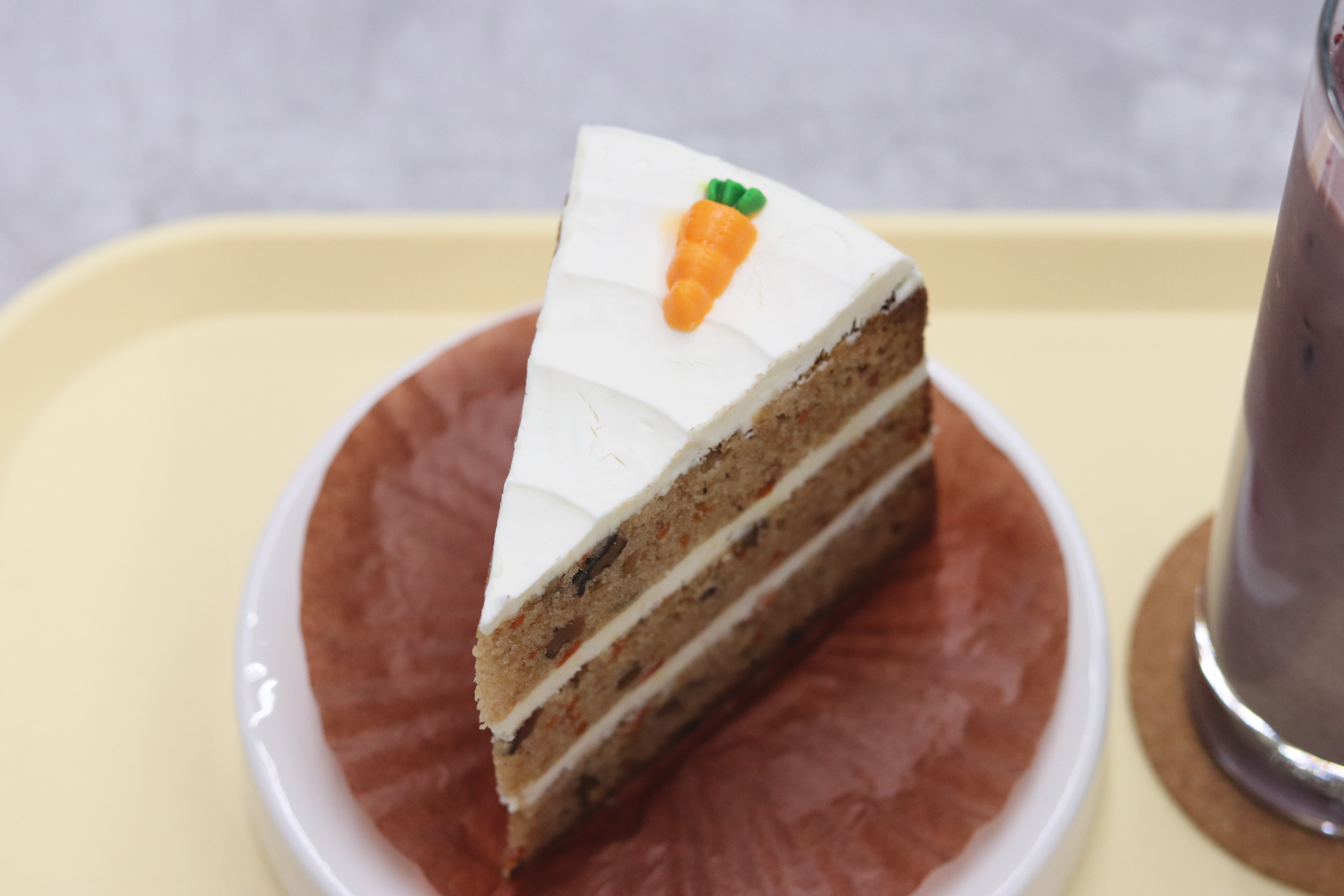 당근케이크는 시나몬 향이 나는 꾸덕한 크림치즈와 고소하고 쫀득한 식감이었습니다. 당근케이크 위에 올라간 당근 모양이 너무 귀여웠어요. 케이크 단면을 보니 채 썬 당근과 견과류가 콕콕 박혀 있는 게 보였습니다. 시트가 퍽퍽하지 않고 촉촉하다고 보시면 되고 당근 케이크 특유의 시나몬 향이 은은하게 감돌면서 중간중간 씹히는 견과류의 고소함이 나는 그런 맛입니다. 오디 라떼가 달콤한 편이라 케이크가 너무 달면 물리지 않을까 걱정했는데, 당근 케이크의 담백하면서도 깊은 맛이 오디 라떼와 의외로 궁합이 좋더군요.