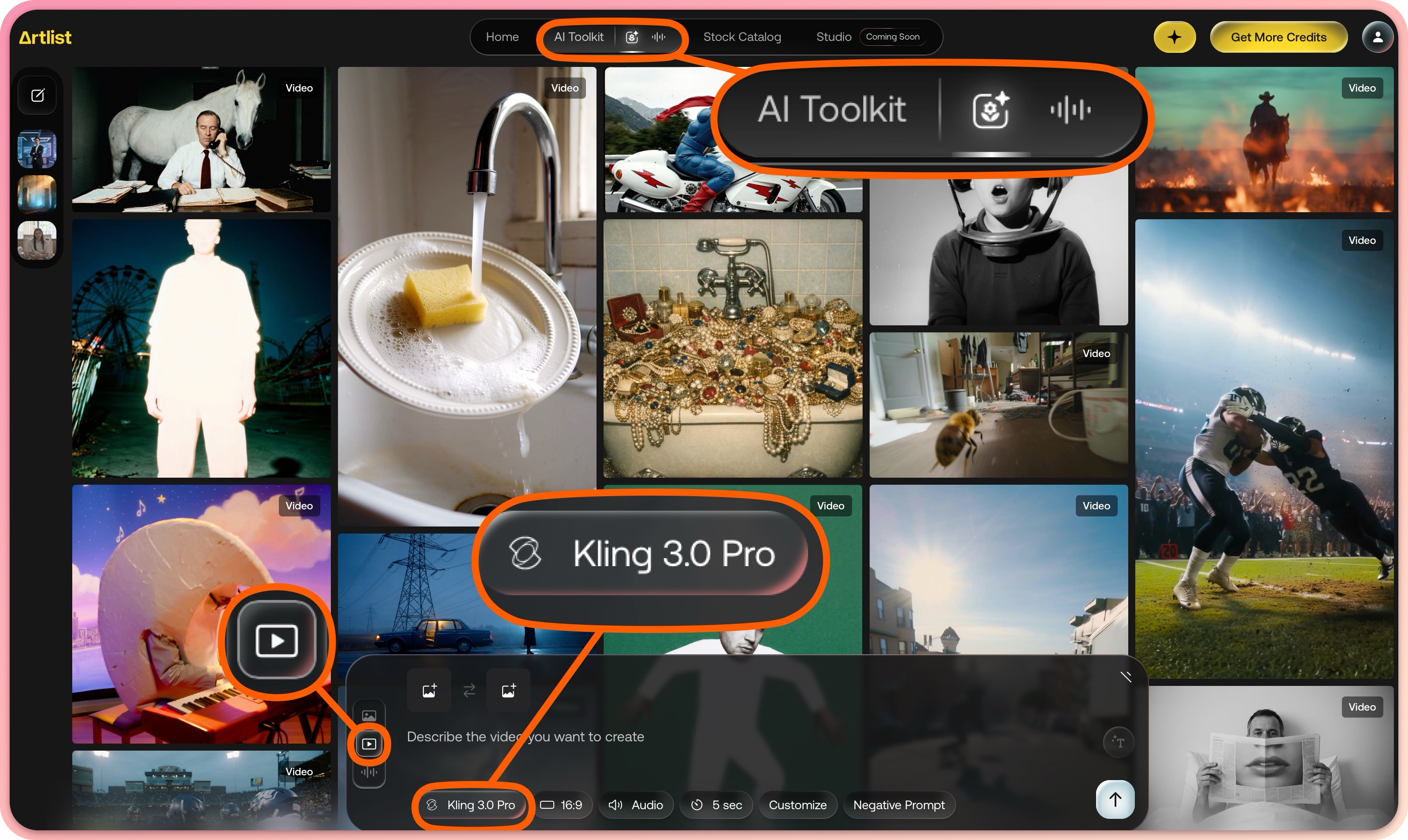 아트리스트 계정으로 로그인한 후, `AI Toolkit` 메뉴에 접속합니다. 또는 첫화면에서 `Kling 3.0`을 클릭해도 됩니다. AI Starter, AI Professional, Artlist Max 플랜에서 클링3를 사용할 수 있습니다.