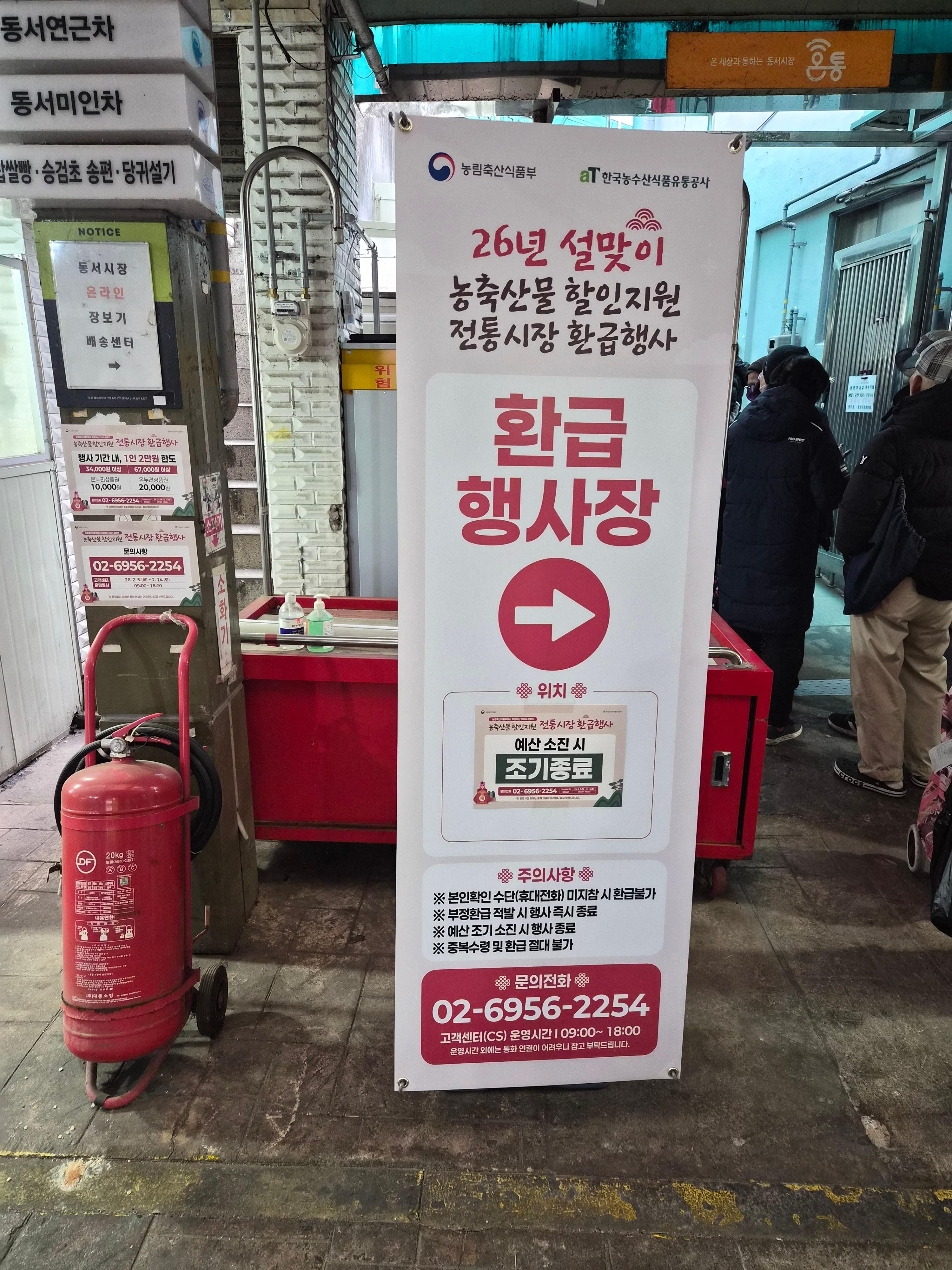 오늘 전통시장 지나가는데 이런 엑스배너가 설치되어 있길래 읽어보고 사진을 찍어보았다. 벌써 환급받으려고하는 줄이 시장 중간까지 이어지고 있었다. 정확한 명칭은 26년 설맞이 농축산물 할인지원 전통시장 환급행사라고 하며 예산이 소진되면 조기에 종료된다. 행사기간은 2월 10일부터였는데 마침 오늘이었다. 농림축산식품부에서 진행하는 정부 공식 행사이므로 전국 모두 공통인 것 같다.